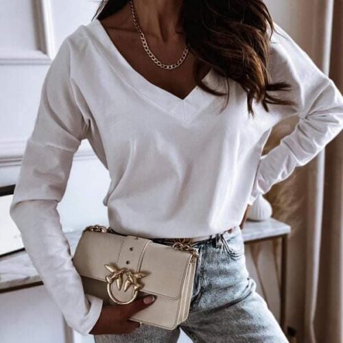 KLASYCZNA , PROSTA BLUZKA , PODSTAWA DO WIELU STYLIACJI – TYCH LUŻNIEJSZYCH, SPORTOWYCH I TYCH BARDZIEJ WYMAGAJĄCYCH. TYŁ BLUZKI I DEKOLT W SEREK.