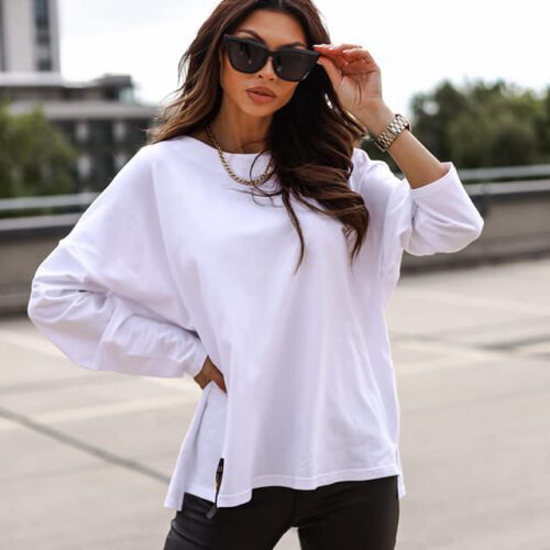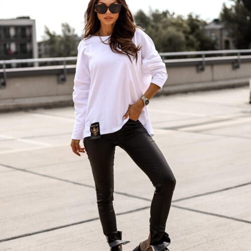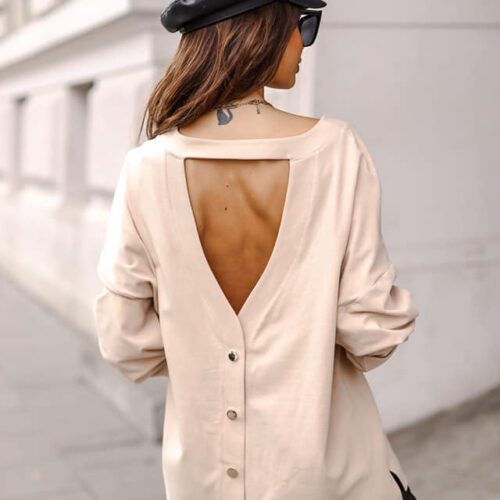 BLUZKA LONGSLEEVE Z ODKRYTYMI PLECAMI. WYKONANA Z NATURALNEJ BAWEŁNY. W PRZODZIE OZDOBNA NASZYWKA. NA PLECACH EFEKTOWNY DEKOLT ORAZ NAPY. STYL MINIMALISTYCZNY. KRÓJ OVERSIZOWY.