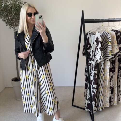 Góra o kroju nietoperza pięknie układa się na sylwetce, zapewniając wygodę i swobodę ruchów. Mocno elastyczna gumka w pasie dopasowuje się do różnych kształtów ciała, dlatego kombinezon wygląda doskonale na rozmiarze 36, 38, 40, a nawet 42. Wyjątkowy, radosny print sprawia, że każda stylizacja nabiera świeżości i letniego luzu.