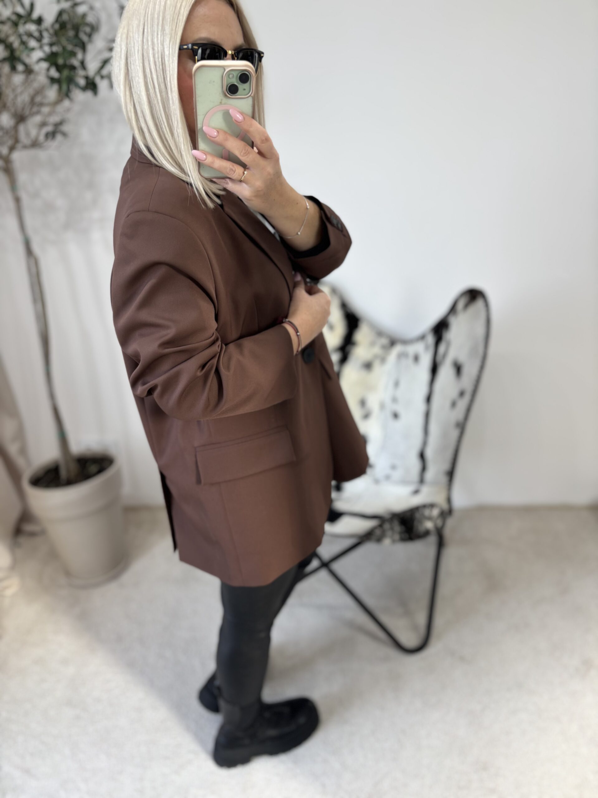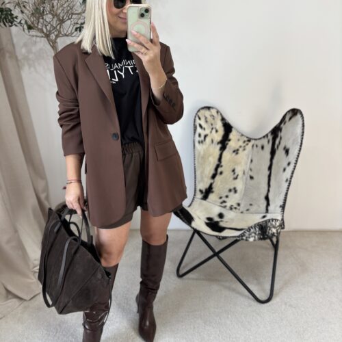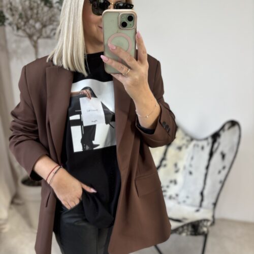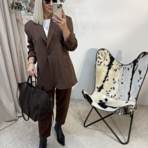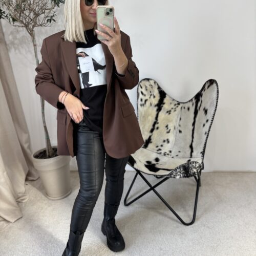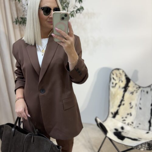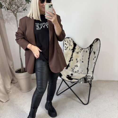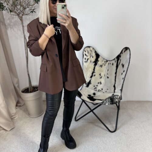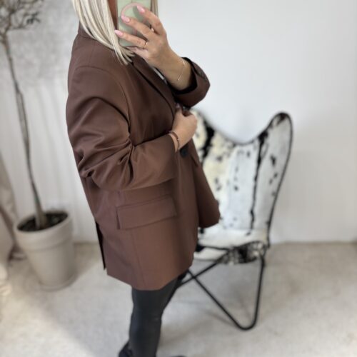 Marynarka oversize w odcieniu głębokiej czekolady to propozycja dla kobiet, które kochają połączenie wygody i niewymuszonej elegancji. Polska produkcja gwarantuje świetną jakość wykonania — materiał jest przyjemny, dobrze układa się na sylwetce i prezentuje się naprawdę stylowo.