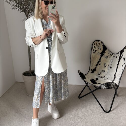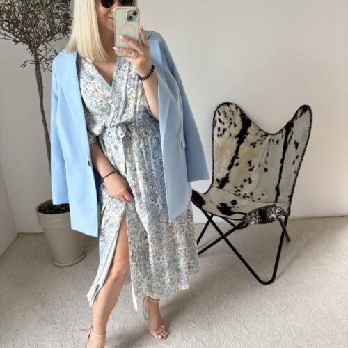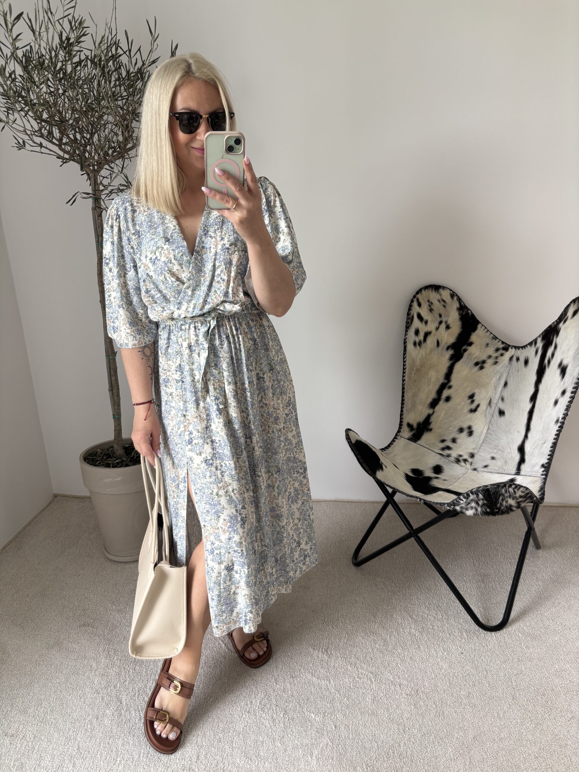 Lekka, zwiewna sukienka w przepiękny, błękitny print kwiatowy. Wykonana w 100% z wiskozy, gwarantuje przewiewność i komfort nawet w najbardziej upalne dni. To model, który doskonale sprawdzi się zarówno w eleganckich stylizacjach, jak i tych zupełnie codziennych — wystarczy dobrać odpowiednie dodatki.