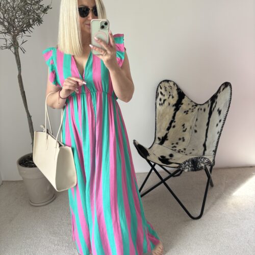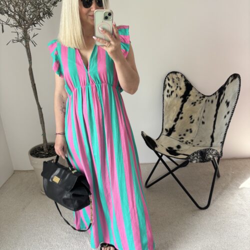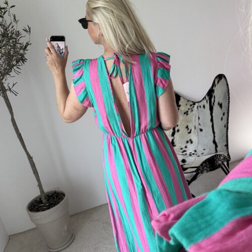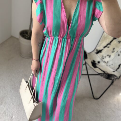 Letnia muślinowa sukienka w połączeniu turkusu i różu to kwintesencja wakacyjnej świeżości i dziewczęcego uroku. Wykonana ze 100% bawełny muślinowej, jest ultralekka, przewiewna i niezwykle przyjemna dla skóry — idealna na upalne dni, kiedy liczy się komfort i swoboda.