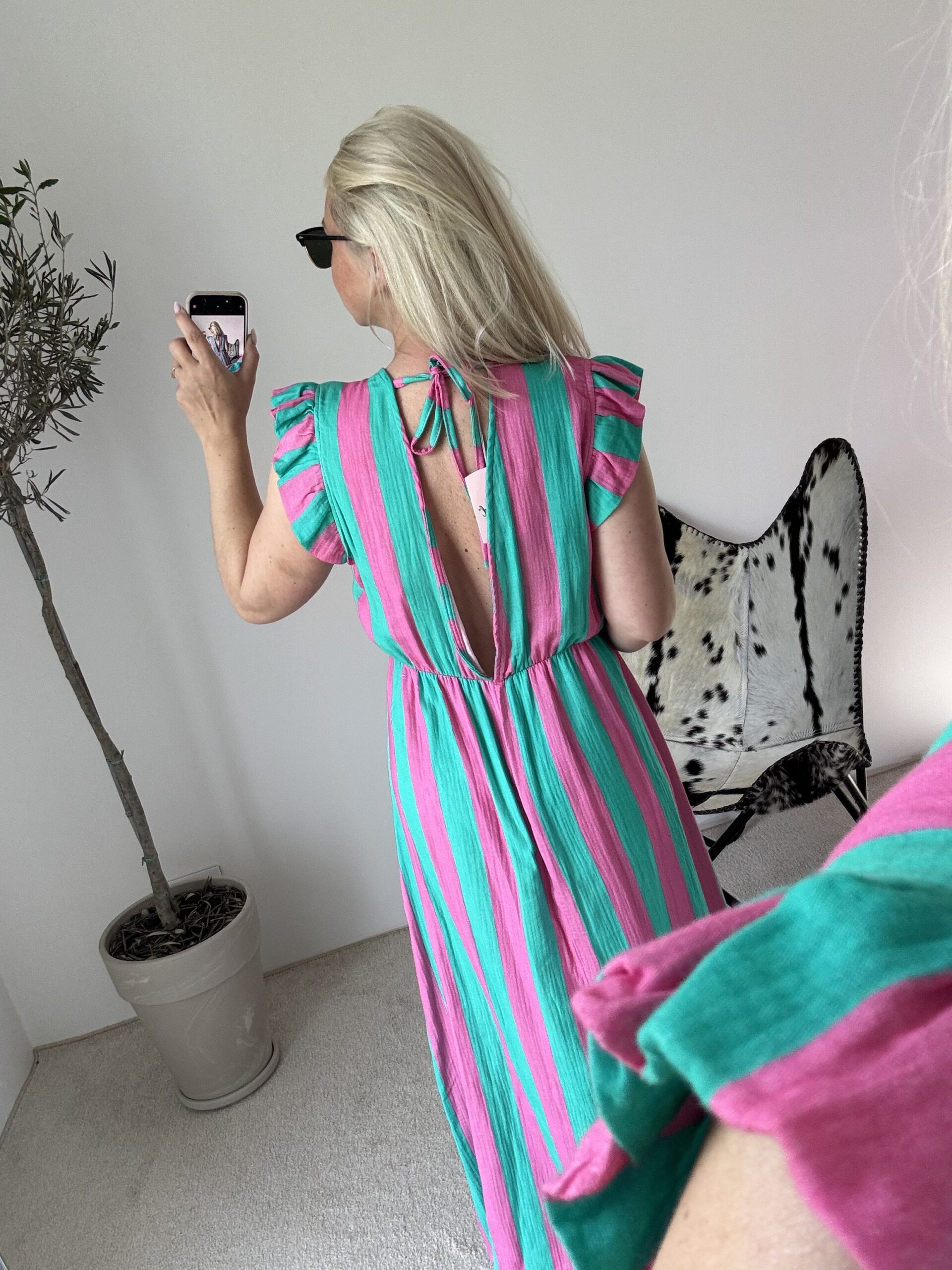 Zjawiskowym elementem tej sukienki jest jej delikatnie odkryty tył, regulowany na sznureczek, który pozwala idealnie dopasować ją do sylwetki i dodaje całości subtelnego, letniego sensualizmu.
