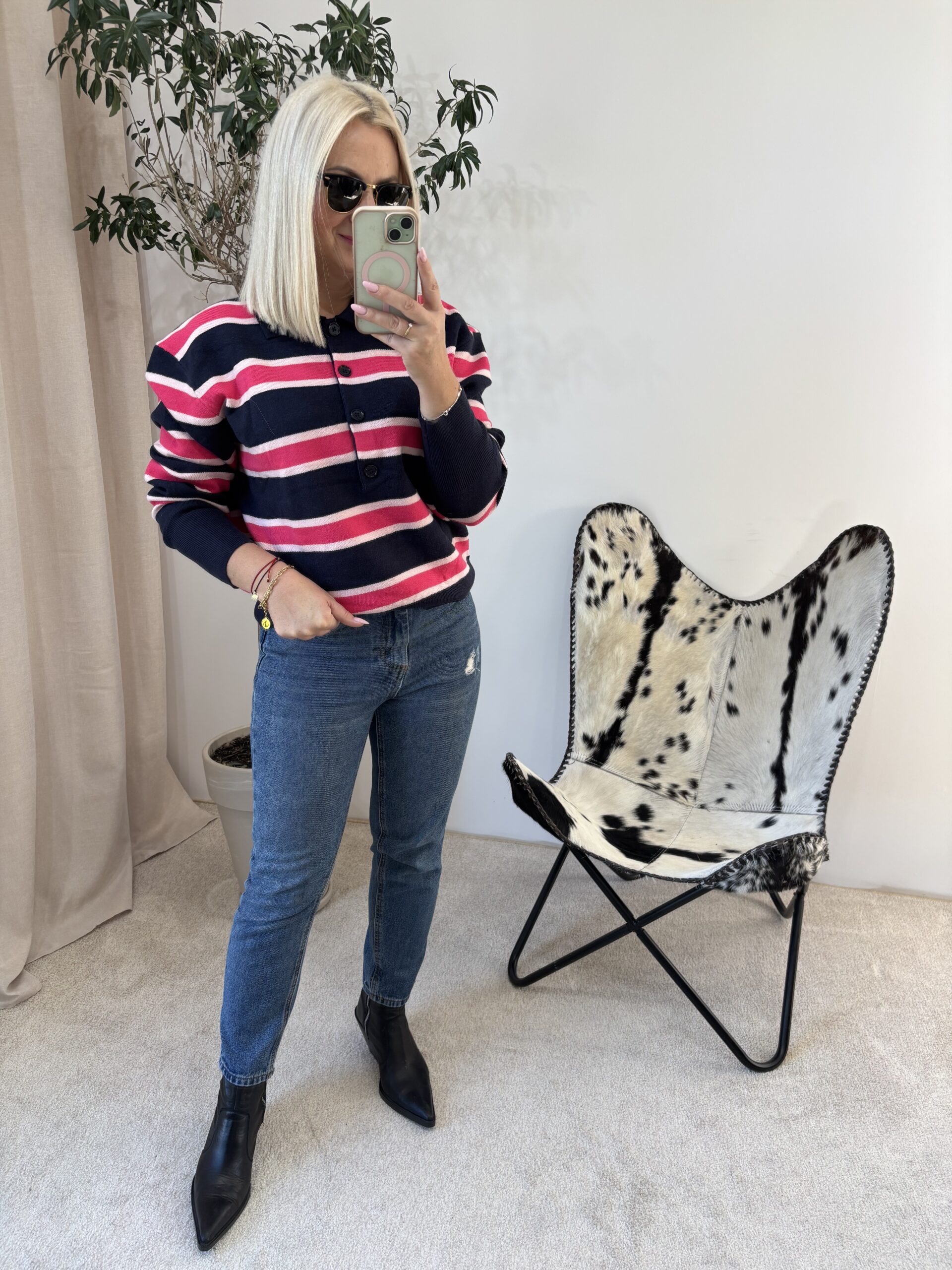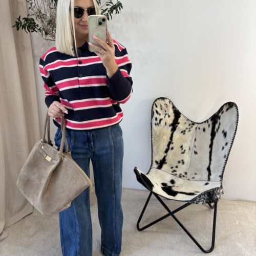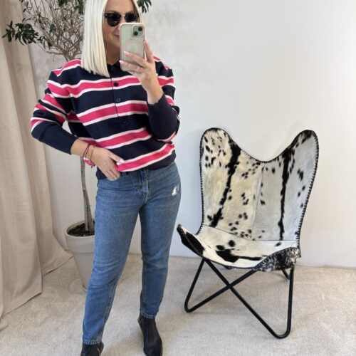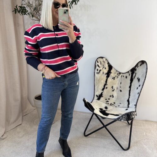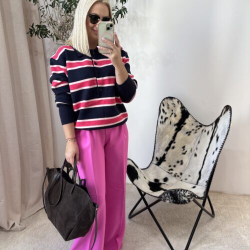 To sweterek, który łączy wygodę z modnym wykończeniem, a kontrast między granatem a różem dodaje mu świeżości i dziewczęcego akcentu.