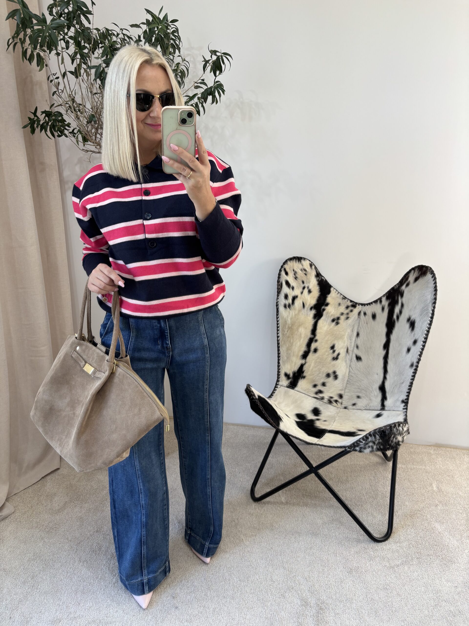 Sweterek polo w połączeniu granatu i delikatnego różu to klasyka w nowoczesnym, kobiecym wydaniu. Wykonany z miękkiej, sprężystej i elastycznej dzianiny, pięknie układa się na sylwetce, zapewniając pełen komfort noszenia przez cały dzień.
