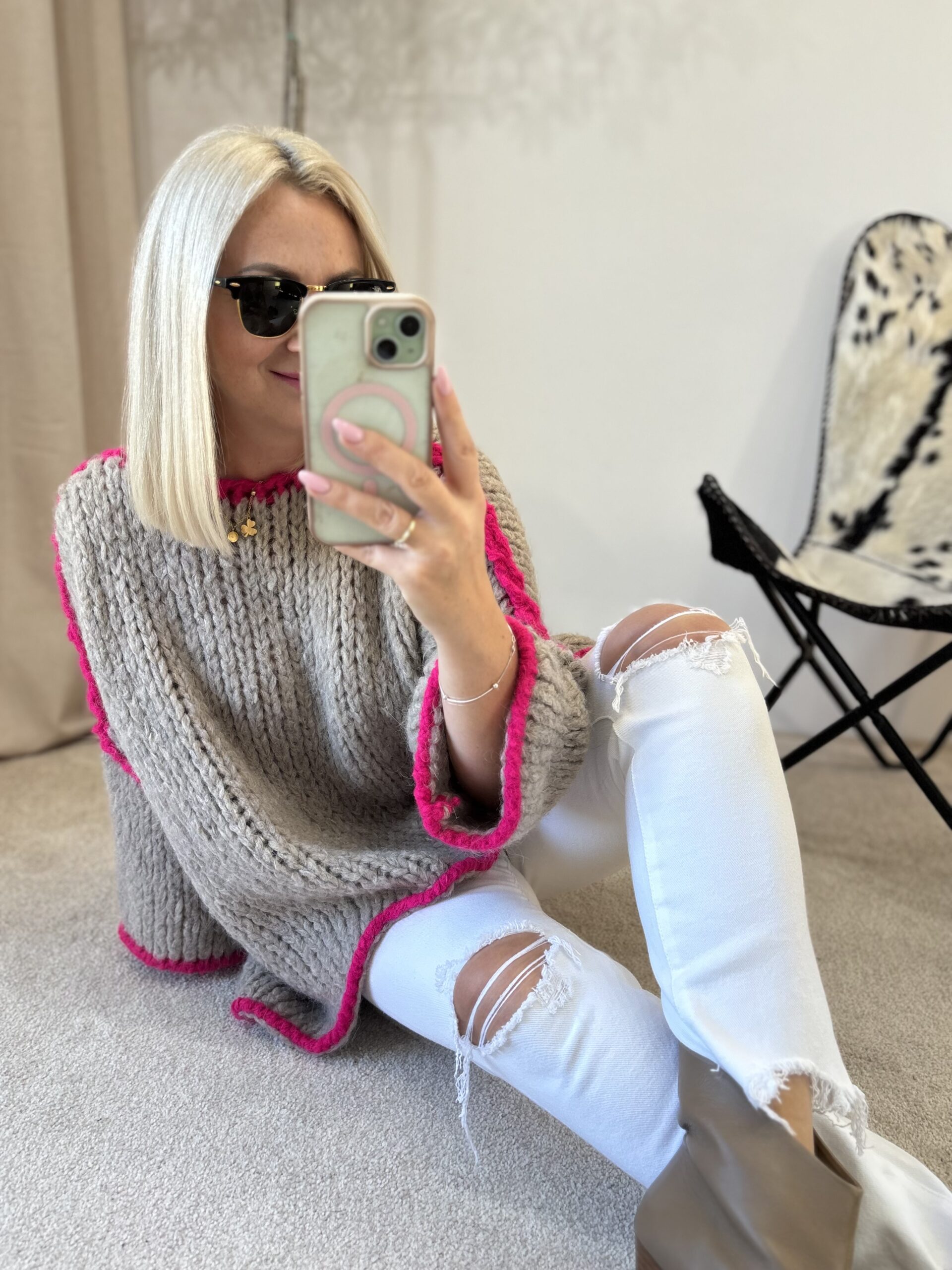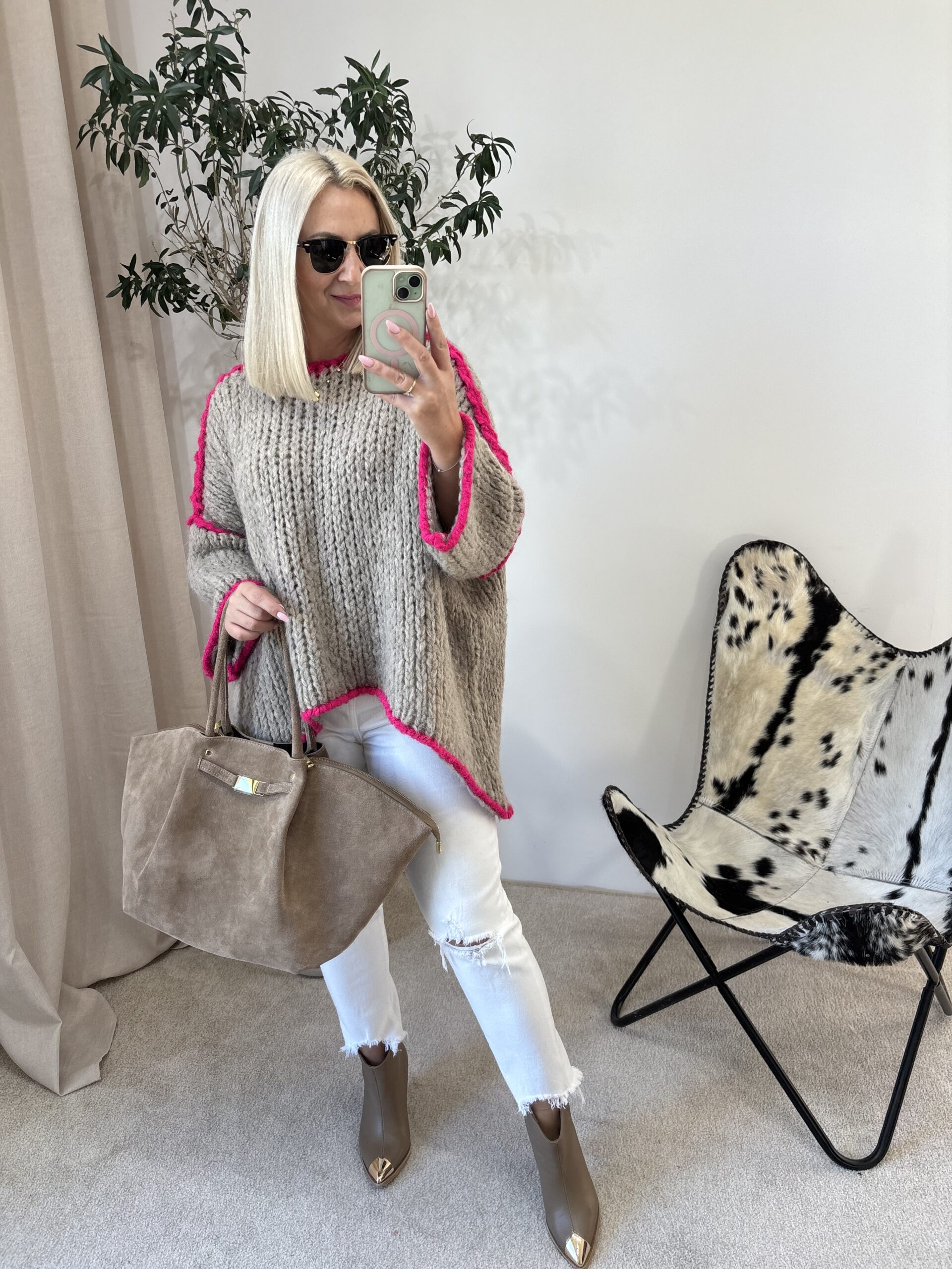 To ponczo-sweter to prawdziwa otulająca perełka na chłodniejsze dni. Cudownie miękkie, szerokie i o grubym, efektownym splocie – daje dokładnie to przyjemne uczucie ciepła, którego szukamy jesienią i zimą. Mimo swojej objętości jest zaskakująco lekkie i bardzo przyjemne w dotyku.